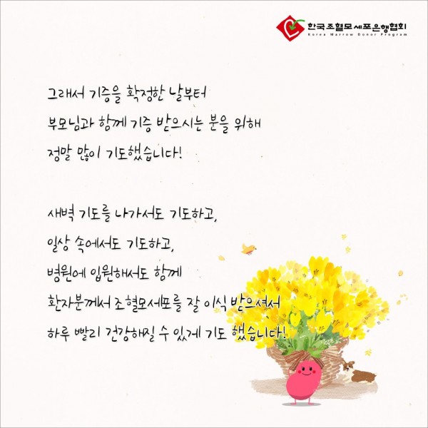 | 다음글 | <조혈모세포 기증 후, 8년>-기증자 김연우 님 2019-03-12 | ||