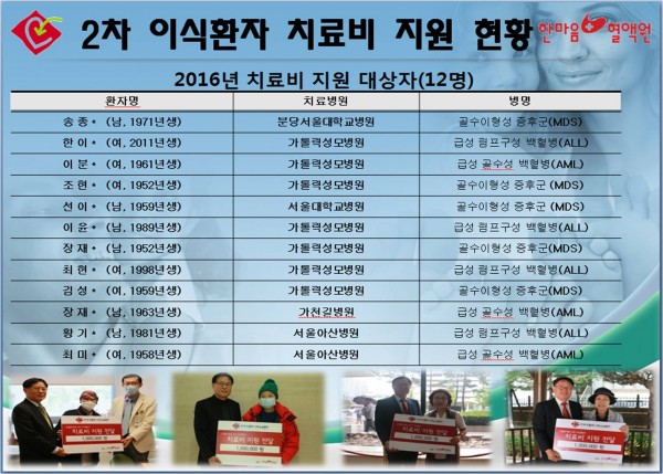| 제목 | 2016년 2차 이식환자 치료비 지원현황입니다. | 작성일 | 2017-01-10 10:08 |